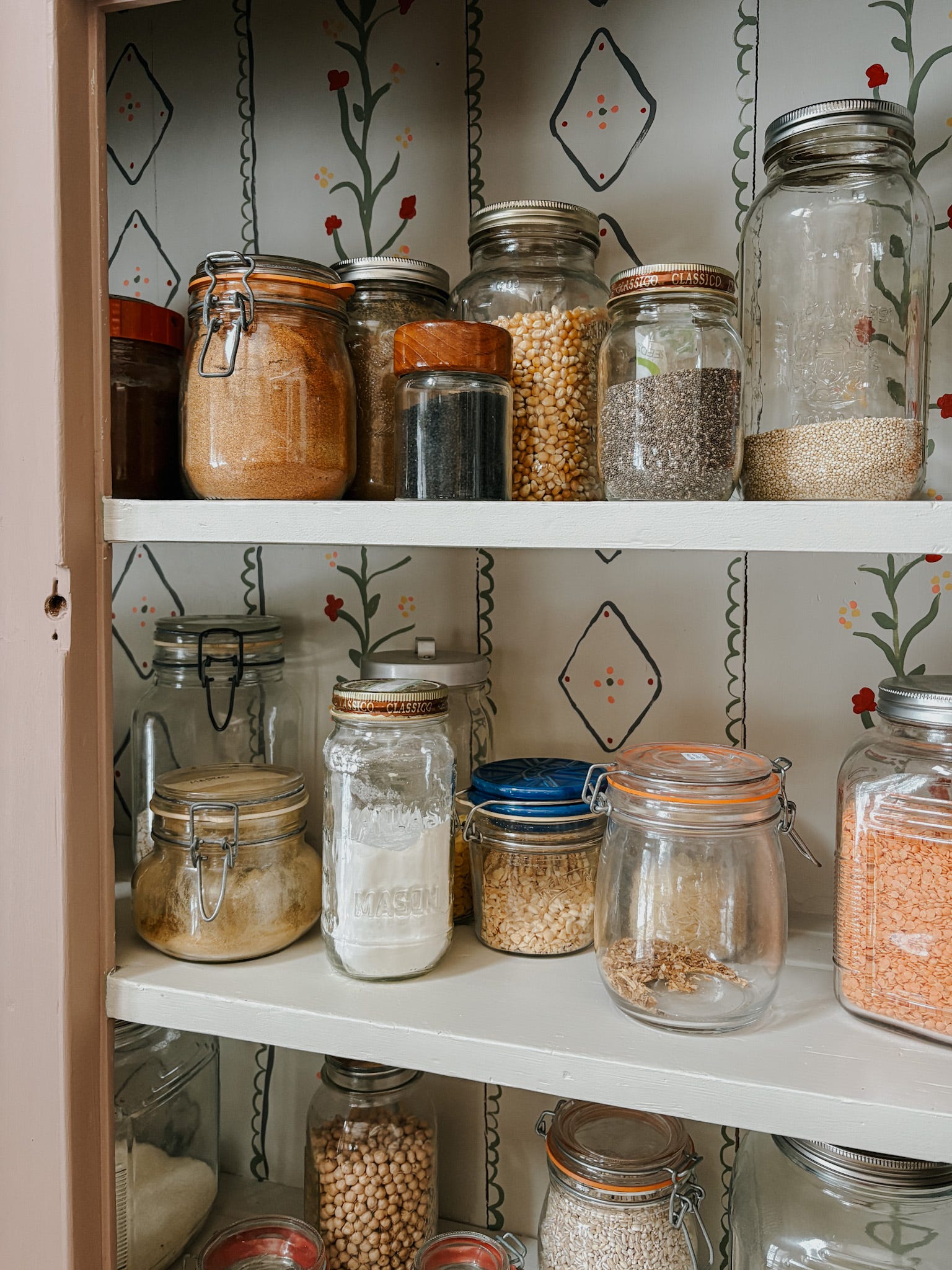 Glass jars and lids are my storage best friend. It’s lovely to be able to see everything and it looks so darn pretty. I turned my dining room buffet into my pantry filling it with my kitchen staples. It’s makes cooking and baking so much easier now with everything visible and easy to find.
